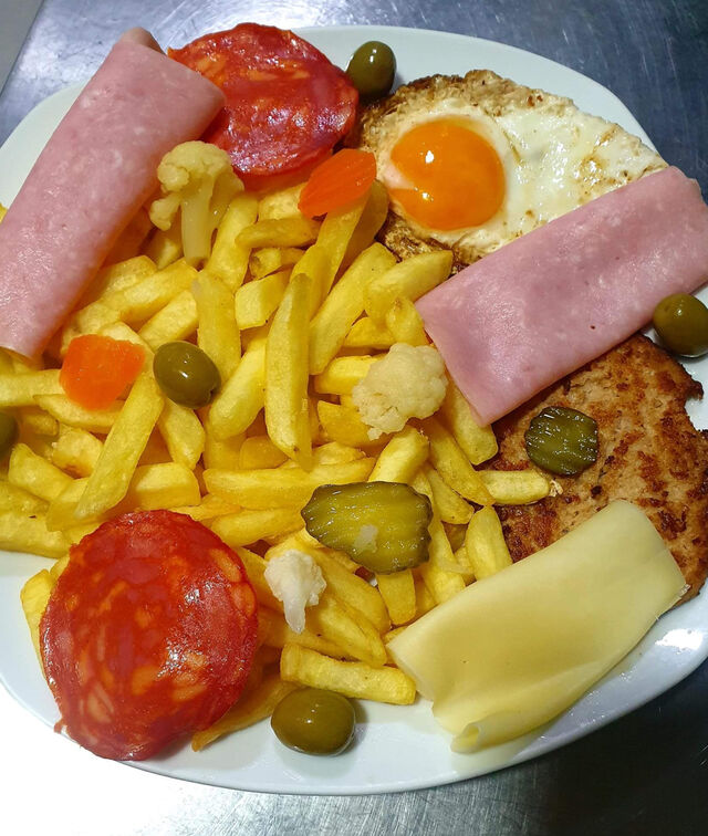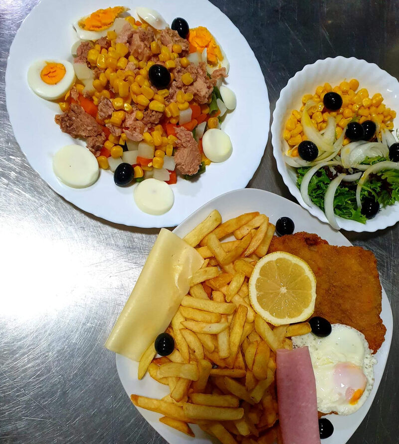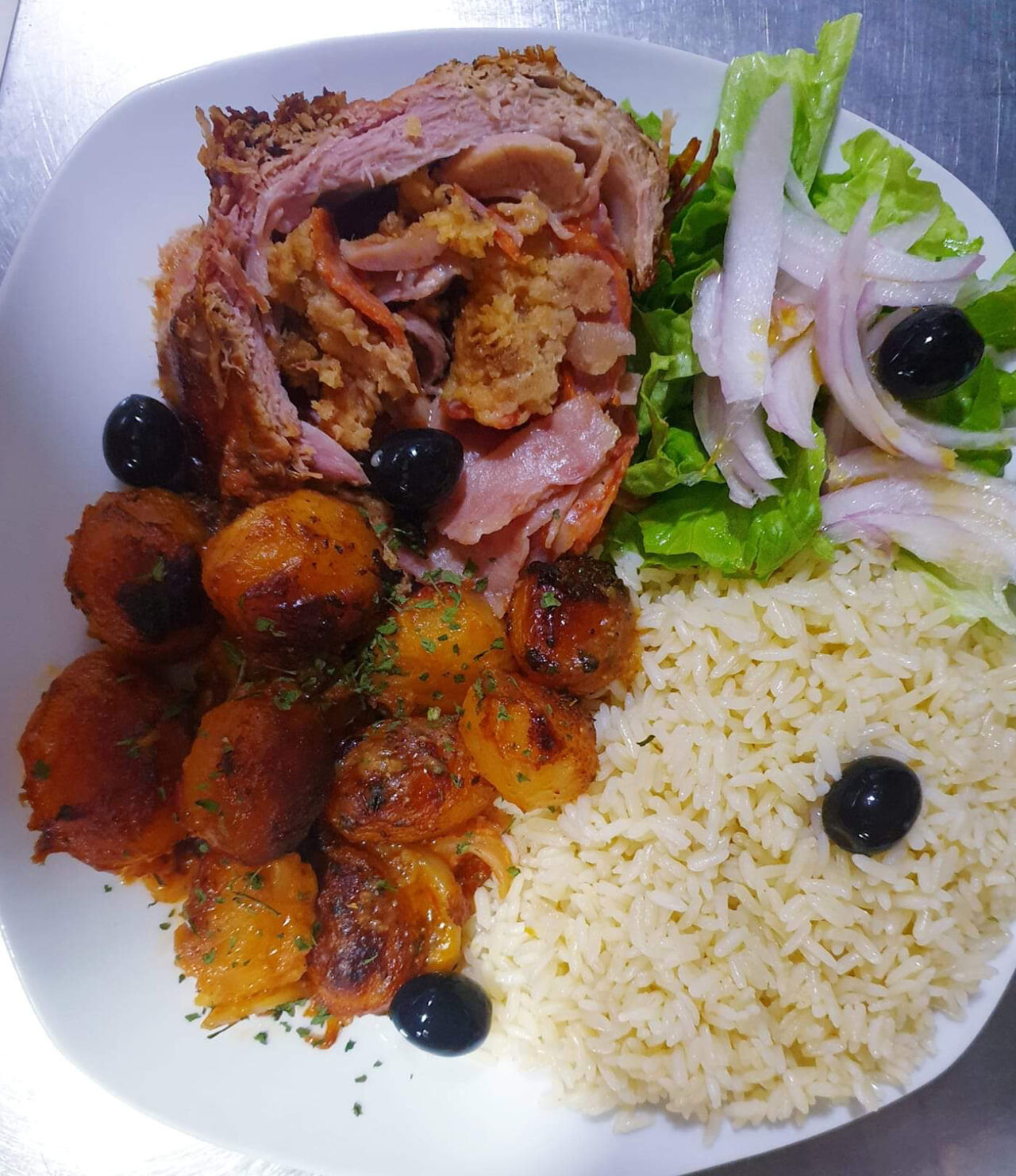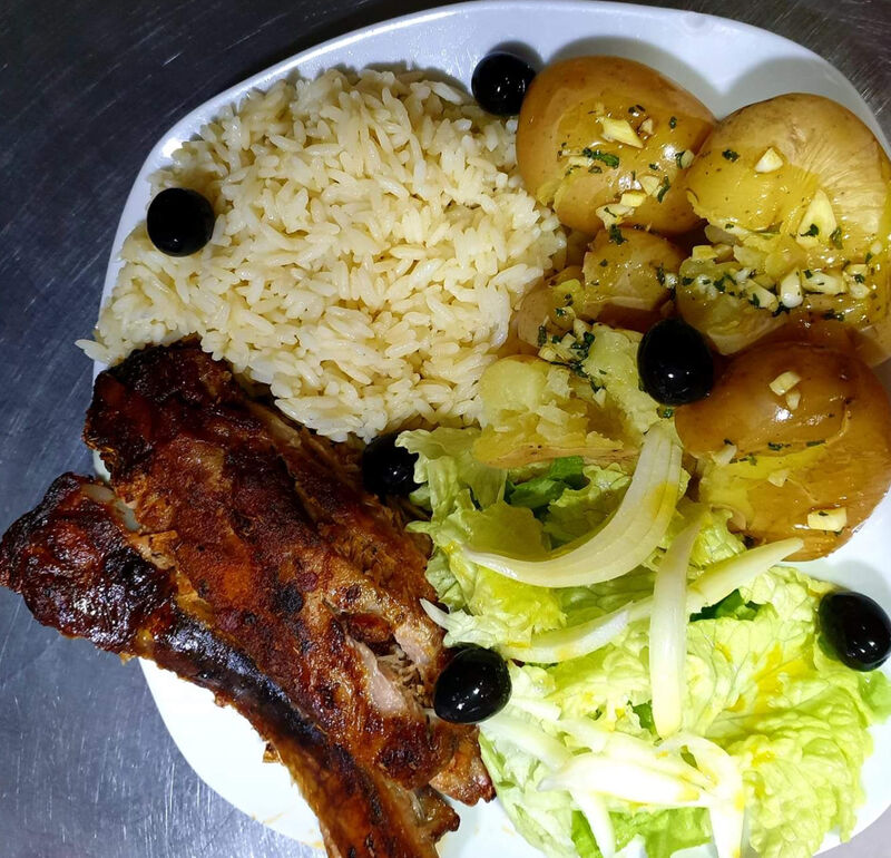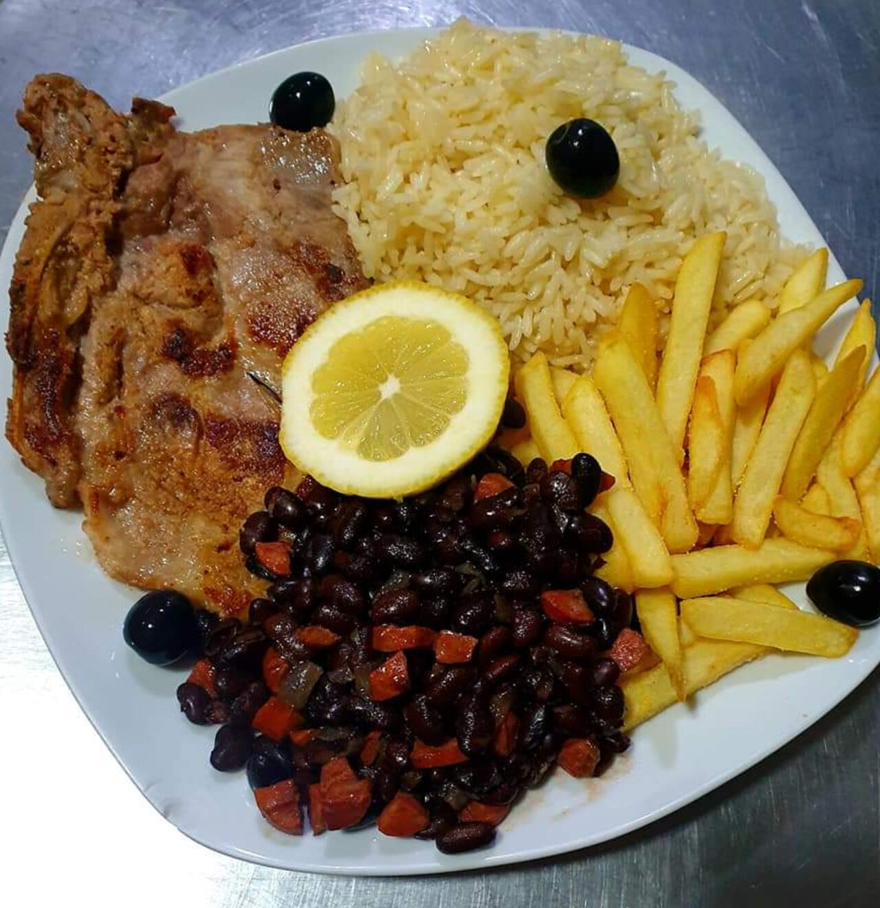 Sopa , Pão, Prato carne ou peixe, bebida e café